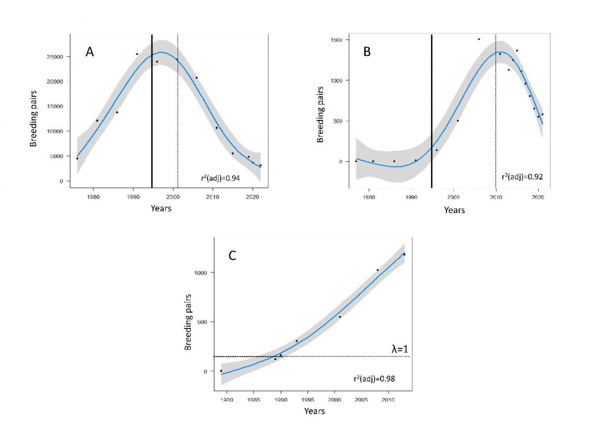 Fig. 2 from the article: (A) Number of yellow-legged gull pairs over time (1976–2022), breeding in human-inaccessible sites (i.e. island cliffs). The vertical solid black line: closure of Vigo landfills. Vertical dashed black line: Establishment of the Atlantic Island National park. (B) Number of breeding pairs of yellow-legged gull over time (1976–2021) breeding in human-accessible islets. The vertical solid black line: closure of Vigo landfills. Vertical dashed black line: first cases of detection paretic syndrome in gulls. (C) Number of yellow-legged gull pairs over time (1977–2019) breeding in the urban area of Vigo city. The horizontal dash black line: stabilization of Vigo city around 280 000–300 000. From 1981 to 2023 the population growth rate, ranged between 0.99 and 1.05 (λ = 1).