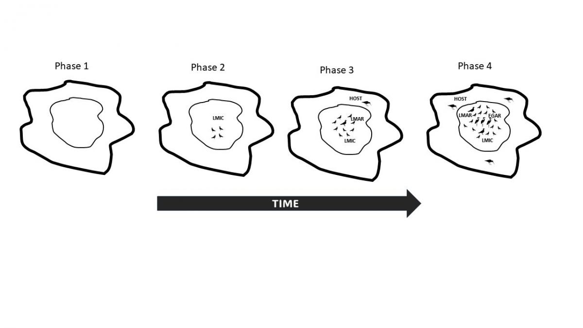 Fig. 4 from the article: Conceptual model that aims to show the process of colonization of human-accessible islets that were formerly empty due to anthropogenic disturbance (based on data from Pedregoso I.)
