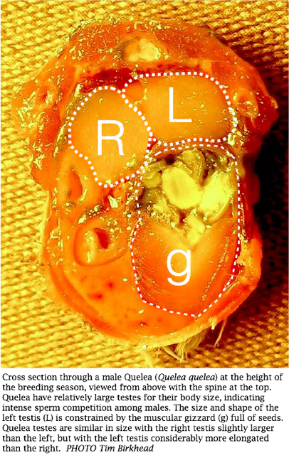 It turns out that about 1/4 of the around 250 species that we studied have the right testis larger than the left and testis shape varied from nearly spherical to very elongated. We found that larger combined testes size is achieved by having testes similar in size. However, most of the variation in asymmetry remains a mystery, including why a larger left testis is the more common ancestral and extant pattern. Perhaps testis asymmetry is a correlated response to selection for asymmetry in female gonads (the right ovary is often absent or degenerate), or it could be the result of as yet unstudied physiological efficiencies due to the rapid growth and recrudescence of bird testes during the breeding season, when they can change 1000-fold in size in just a few weeks.